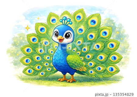 幸運をもたらすイラスト。美しく羽を広げた孔雀の正面イラスト。鮮やかな装飾が印象的な鳥のアート作品