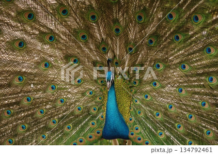 繁殖期にアピールする雄クジャクの後ろ姿1
