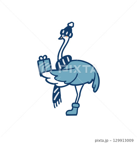 寒い中でプレゼントを持って立っている横向きダチョウのカラーイラスト