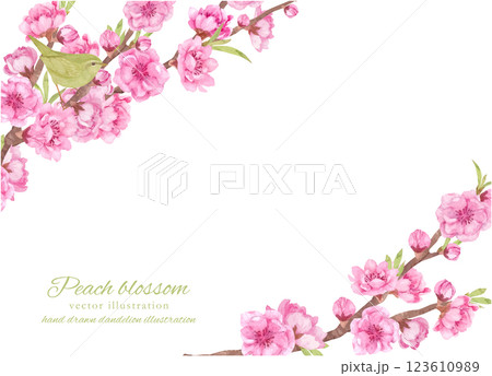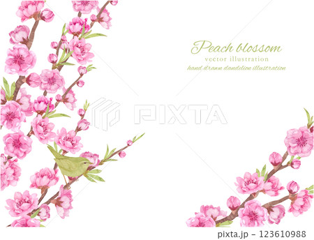 水彩で描いた桃の花の枝とうぐいすのベクターフレーム