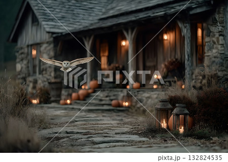 Rustic Autumn Night with Flying Owl and Lantern-Lit Cottage Generative AI