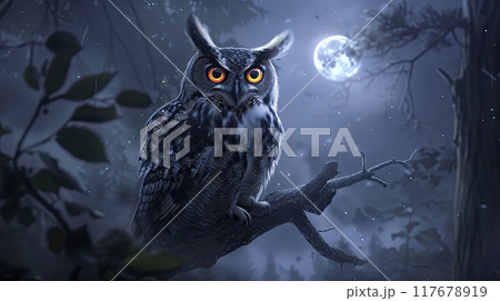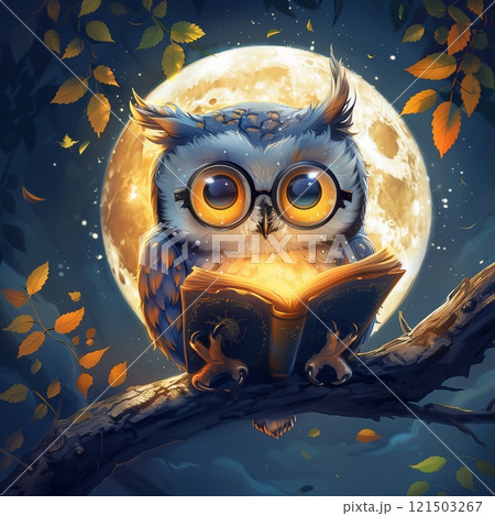 A whimsical owl reading a book under a full moon, surrounded by autumn leaves, evoking a magical atmosphere.