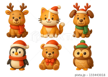 Png set of cute 3d christmas animals with santa hats and scarves isolated on transparent background. concept of holiday decor, festive characters, winter celebration elements.