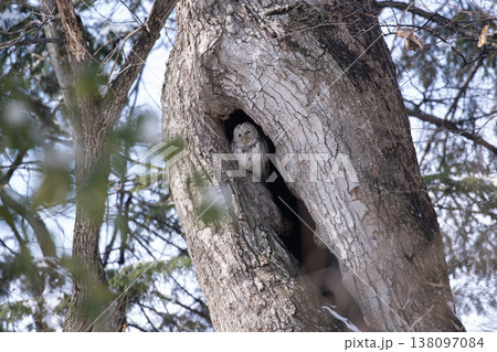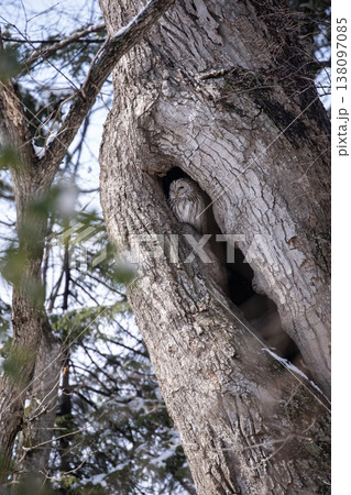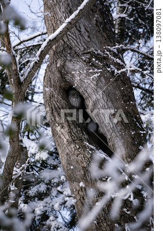 巣立ち間近の子供を見守るエゾフクロウのお母さん