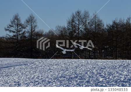 北海道鶴居村の給餌場を飛ぶタンチョウ