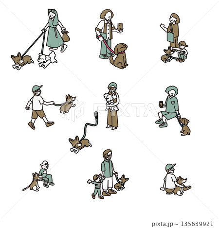 犬を散歩させる人々のイラスト