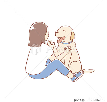 部屋で愛犬と過ごす若い女性のイラスト素材