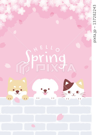 桜の花と煉瓦の壁から顔を出す犬と猫の背景イラスト
