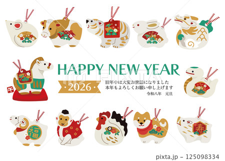 2026年 午年の年賀状 年賀状デザイン 馬と干支の土鈴イラスト