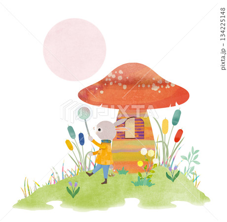 クレヨンタッチ うさぎが御神体の神社 手描きイラスト