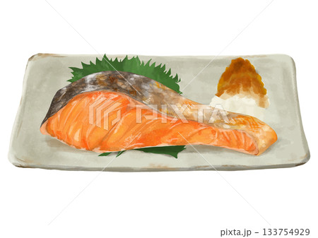 水彩風、ミョウガを付け合わせた秋の味覚、焼き鮭
