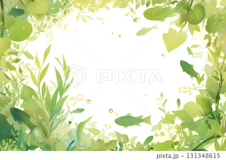 青い海の中に魚たちが泳いる爽やかなイラスト。水彩画の優しい色合いを生かした風景。
