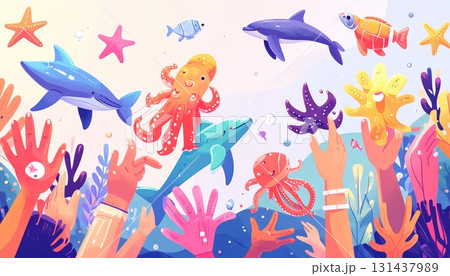 海の生き物ベクターイラスト イルカ ヒトデ 巻貝 クラゲ サンゴ 海藻 熱帯魚 碇 水族館