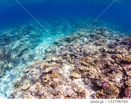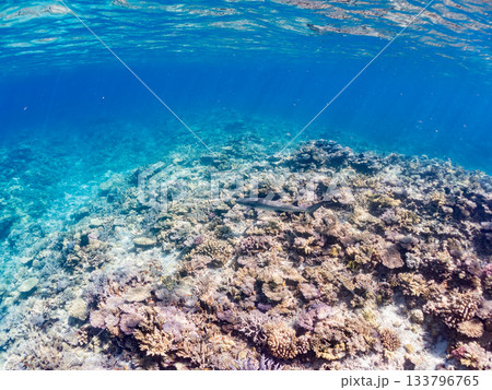 大きく美しいネムリブカ他。美しいサンゴ礁と熱帯魚の群れ。 安室島嘉比島沖縄県 島尻郡慶良間諸島座間味