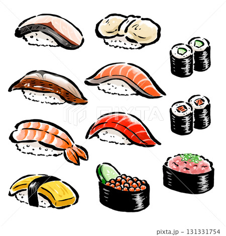 色々な寿司 単色線画のみ 筆タッチ手描きイラスト