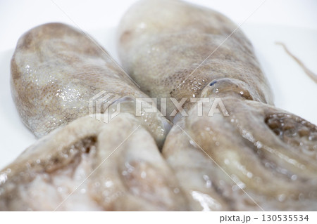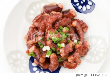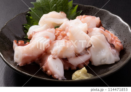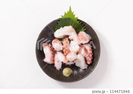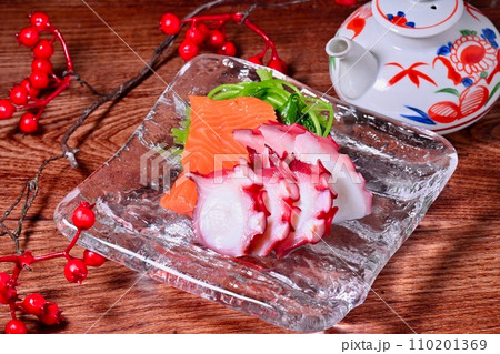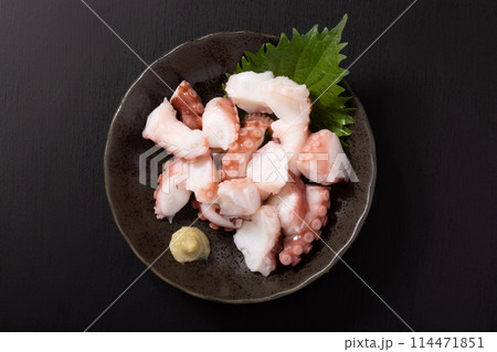タコ(たこ・蛸)とサーモンのお造り、お刺し身。ミツバ(茹で)を添えて。
