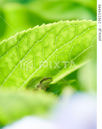 紫陽花の葉に隠れ安らぎリラックスする一匹のニホンアマガエル