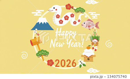 富士山や宝船など縁起物を配した和風ポップな2026年巳年の年賀状イラスト