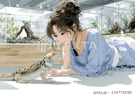 爬虫類カフェでトカゲと触れ合う女性のイラスト