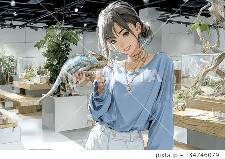 爬虫類カフェ カメレオンを手に持って笑顔になる女性のイラスト素材