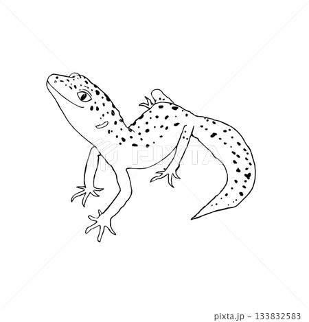 リアルで可愛いレオパのモノクロイラスト。白黒。ヒョウモントカゲモドキ。