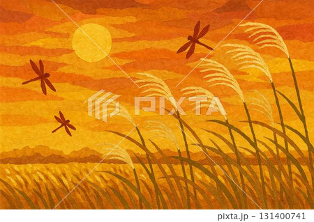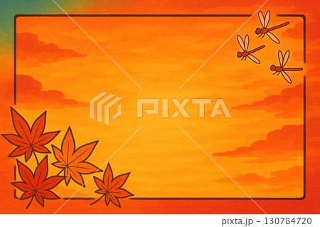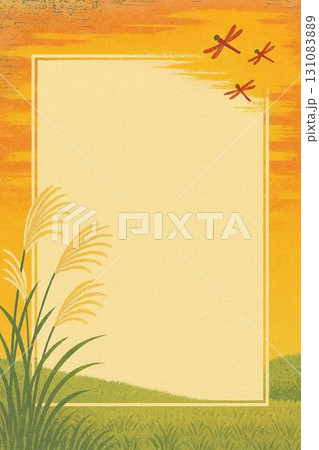 フレーム素材 秋イメージ 夕焼け空 ススキ 赤とんぼ 版画調