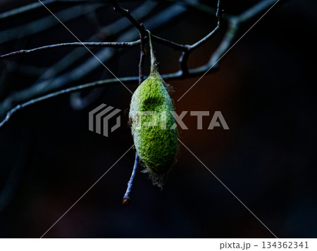 秋の木の枝に付くクスサンの繭すかしだわら