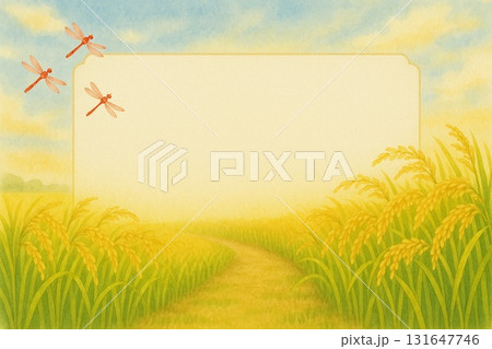 フレーム素材 収穫前の稲・田んぼ 赤とんぼ 水彩画