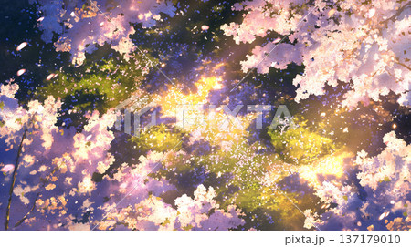 桜が舞い散る春の幻想風景。光に包まれた空を見上げるような構図が、季節の移ろいと心の静けさ