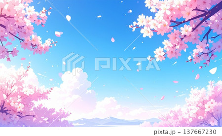 桜の花びらが舞う春の背景イラスト 青空と満開の桜