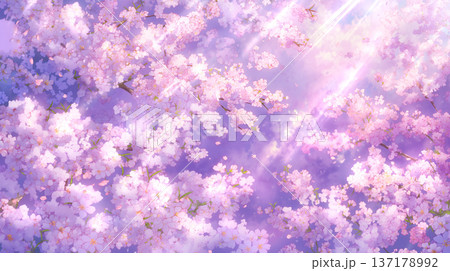 春の空に広がる桜の花。淡い光が差し込む幻想的な雰囲気が、癒しや静寂を表現するのにぴったりな和風背景