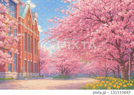 《AI画像》桜と青空のある春の街並みの風景イラスト