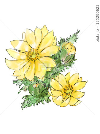 咲き誇る福寿草の手描きの線画と水彩イラスト