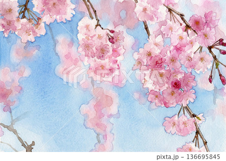 満開の枝垂れ桜を見上げる・水彩画