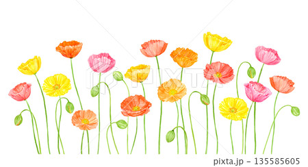 水彩で描いたカラフルなポピーの花畑