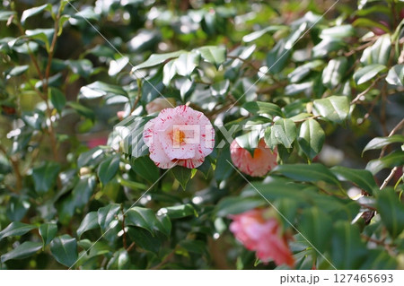 ピンク色のツバキの花が咲いています。学名はCamellia japonicaです。
