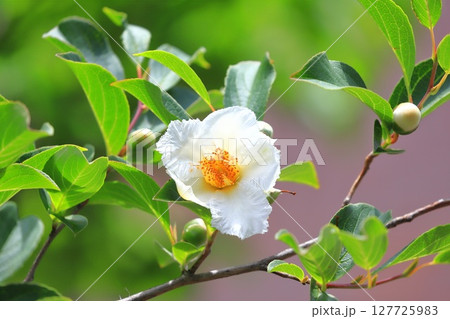 可憐な夏椿(ナツツバキ)の花とつぼみ