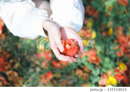 椿をもつ女の子の手