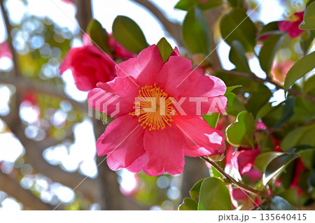 木漏れ日の中咲くサザンカ