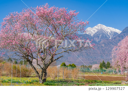 春の花が咲く丹霞郷と北信の山々と青空と