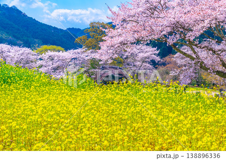 桜咲く藤原宮跡 菜の花畑と桜並木の風景 飛鳥・藤原の宮都 奈良観光スポット