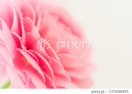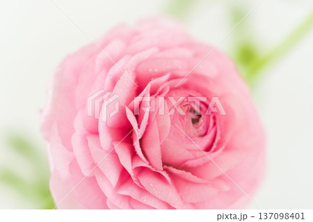 水滴の付いたピンク色のラナンキュラスの花をマクロ室内撮影32