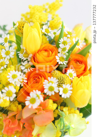 ミモザ入りのフラワーアレンジ オレンジ色 黄色