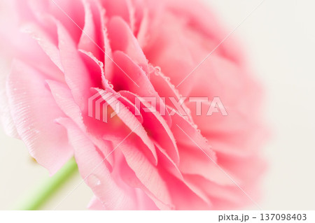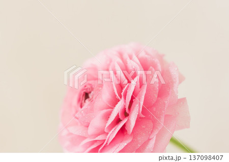 水滴の付いたピンク色のラナンキュラスの花をベージュ背景でマクロ室内撮影07