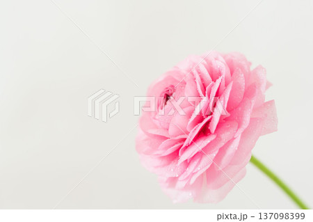 水滴の付いたピンク色のラナンキュラスの花をベージュ背景で室内撮影22