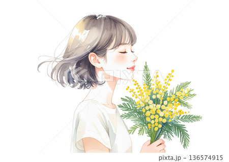 ミモザの花束を持つ女性のイラスト 水彩画風