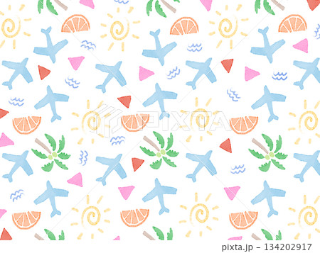 白背景に手描きイラストパターン。夏の旅行やビーチ・リゾートのコンセプト。水彩の飛行機とヤシの木