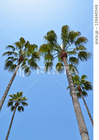 明るい青空と強い日差しの下に並ぶ大きなヤシの木 カナリア諸島のフエルテベンテュラ島にて