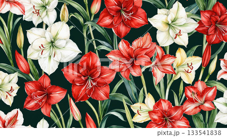 情熱的な赤と白のアマリリスが咲き誇る水彩画風の華やかなボタニカルパターン