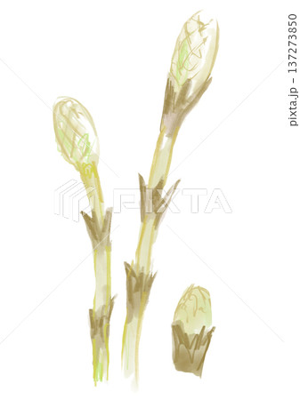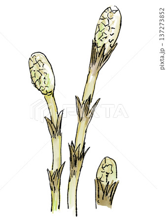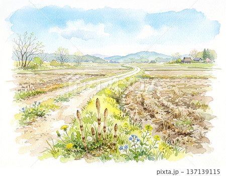 春の田舎の風景 田んぼのあぜ道に生えるツクシの水彩イラスト